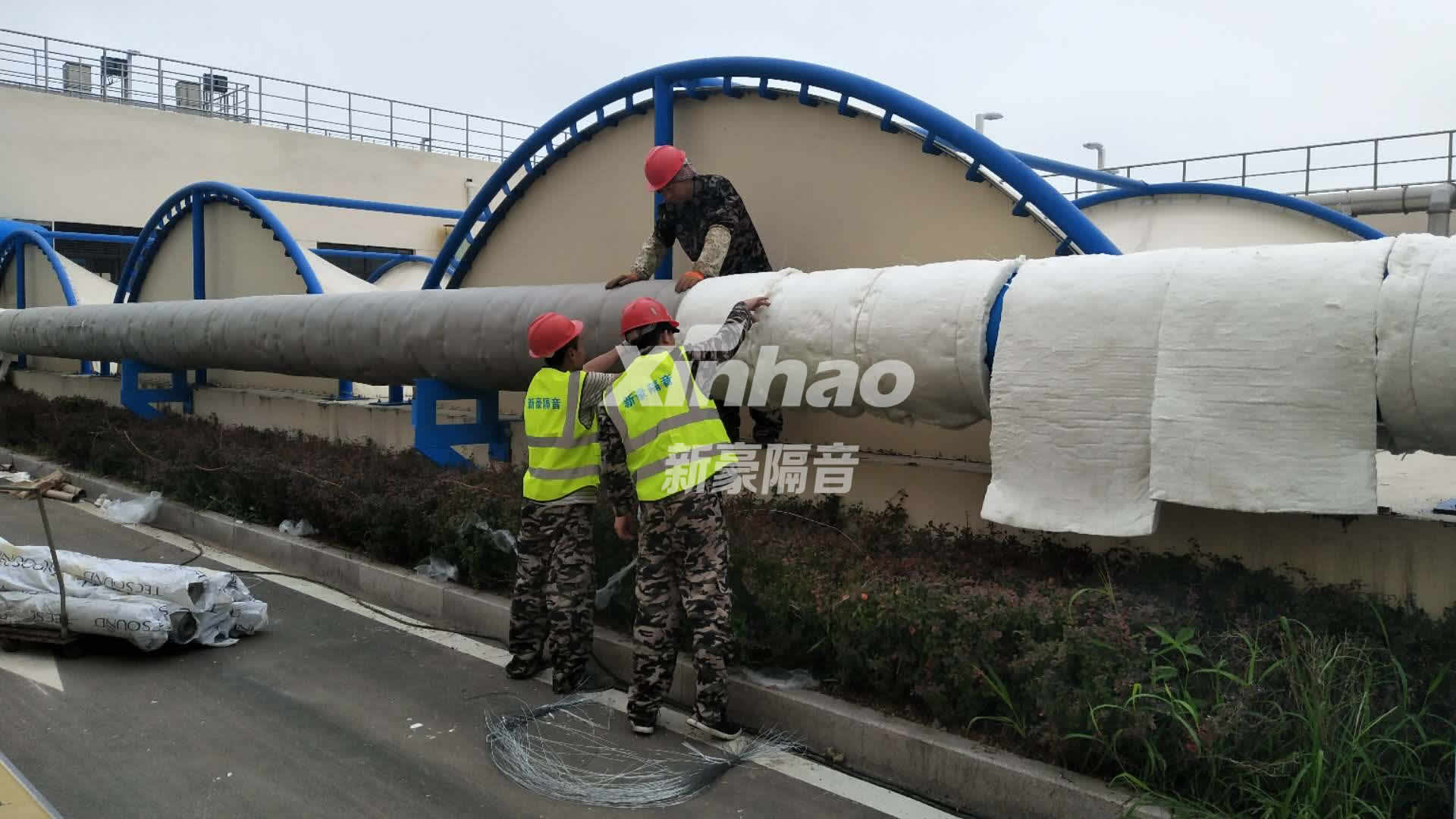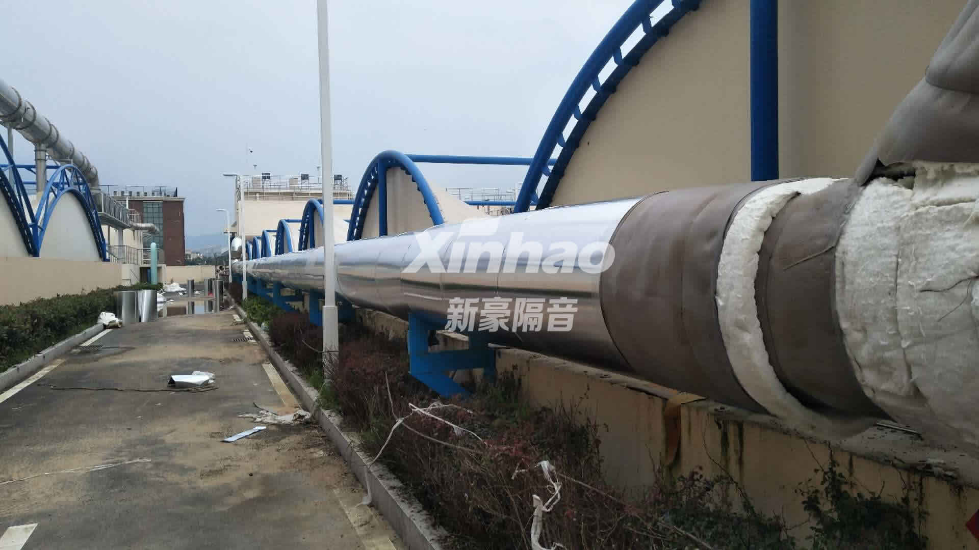 本工程位于青島麥島路,東側(cè)緊鄰銀海國(guó)際學(xué)校,北側(cè)馬路對(duì)面為高檔小區(qū)所在地,羅茨風(fēng)機(jī)在正常的工作過(guò)程中,管道內(nèi)由于氣壓產(chǎn)生嚴(yán)重的噪聲干擾整體廠區(qū)環(huán)境,進(jìn)而影響到隔壁的學(xué)校及遠(yuǎn)處的居民。本案例中,現(xiàn)場(chǎng)情況較為復(fù)雜,管道有多次變徑及走向改變,為了保證最佳效果必須對(duì)現(xiàn)場(chǎng)管道進(jìn)行部分的整改,詳細(xì)施工如下:1、DN500管道上移,DN300管道改變走向。2、利用進(jìn)口隔音材料對(duì)管道進(jìn)行隔音包扎。3、對(duì)敏感噪音源位置處安裝隔聲屏障。經(jīng)以上多方面治理,最終順利驗(yàn)收,得到業(yè)主的一直好評(píng)。