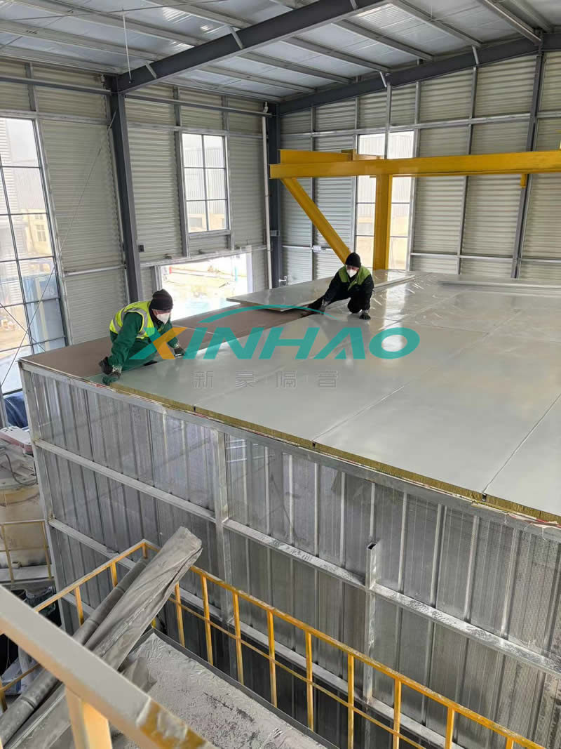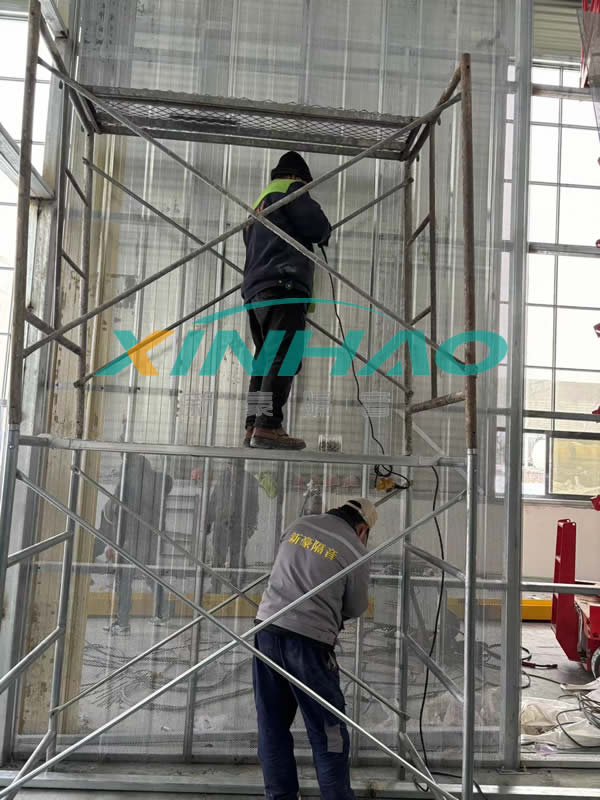 1、多種材料復合使用,單一材料無法滿足現(xiàn)場的降噪要求,隔聲吸聲相結(jié)合的處理方式,外部為主隔聲構(gòu)件,內(nèi)部為吸聲模塊,解決室內(nèi)整條混響問題。