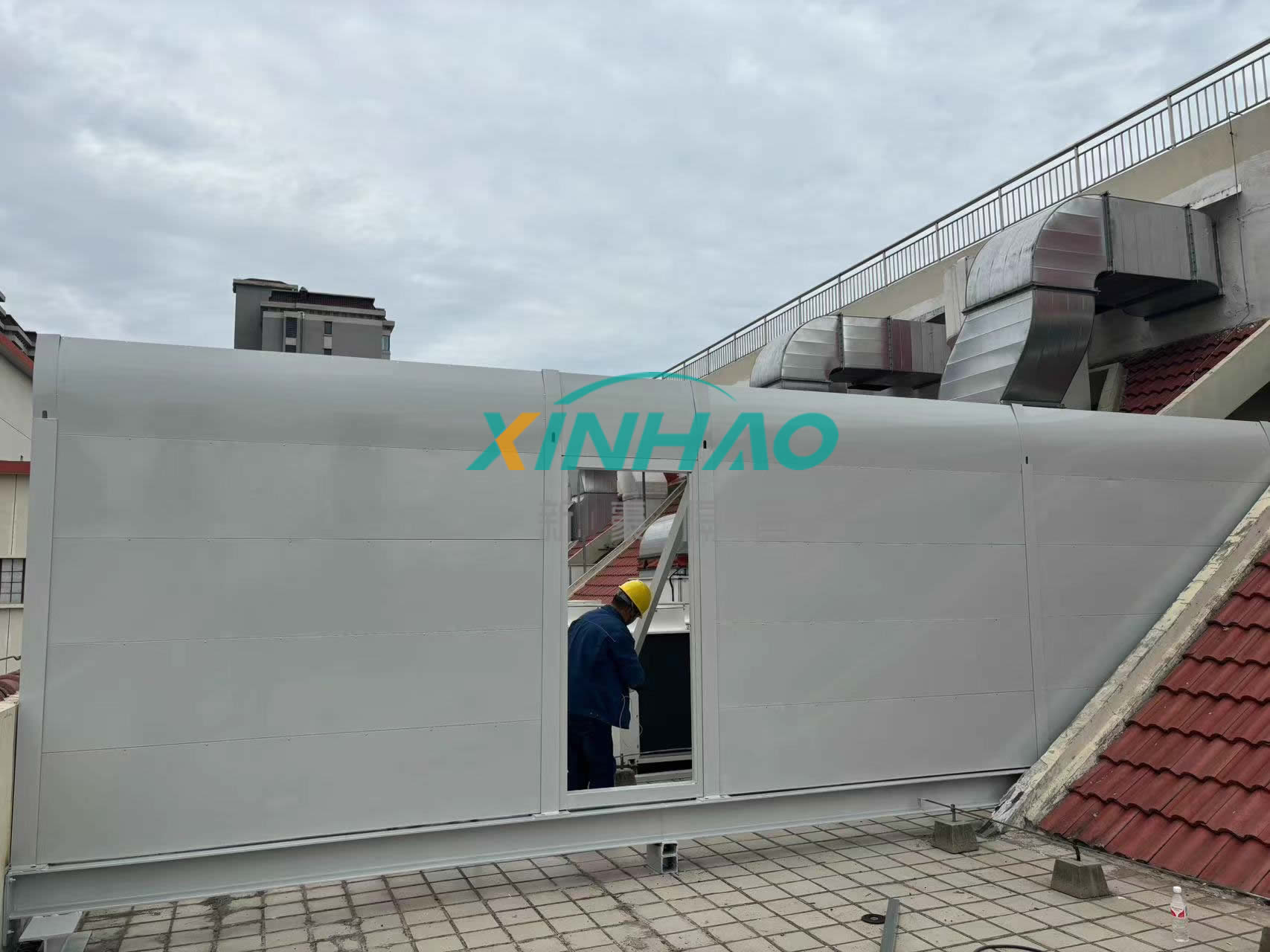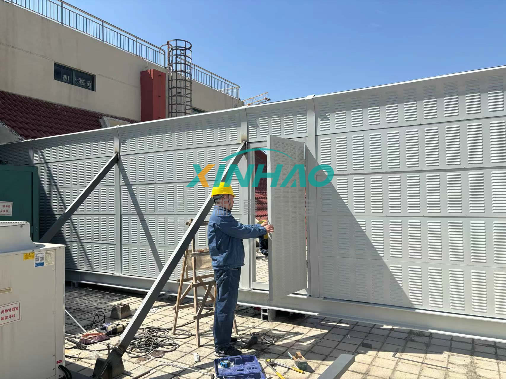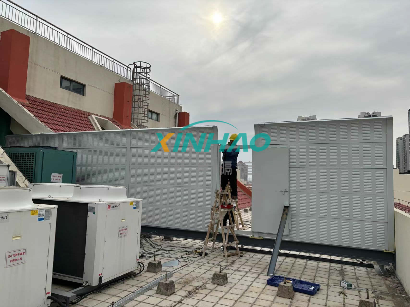 根據(jù)我公司技術人員現(xiàn)場勘查,噪聲源為3樓頂8組模塊機組高頻噪聲及一組室外冷凝器機組噪聲,影響區(qū)域為西北側居民樓,現(xiàn)女兒墻位置噪聲為62-63dB,低頻125HZ噪聲為72dB,按照環(huán)保局區(qū)域劃分標準,此區(qū)域為國家二級環(huán)境噪聲區(qū)域,噪聲排放標準為:晝間:60dB 夜間:50dB,根據(jù)噪聲對比設備運行時噪聲會對居民區(qū)有噪聲影響。所以需要對設備區(qū)域進行隔聲遮擋。整體貼近設備區(qū)域搭建隔聲屏障,進行降噪處理。處理完畢后,治理效果得到甲方認可。