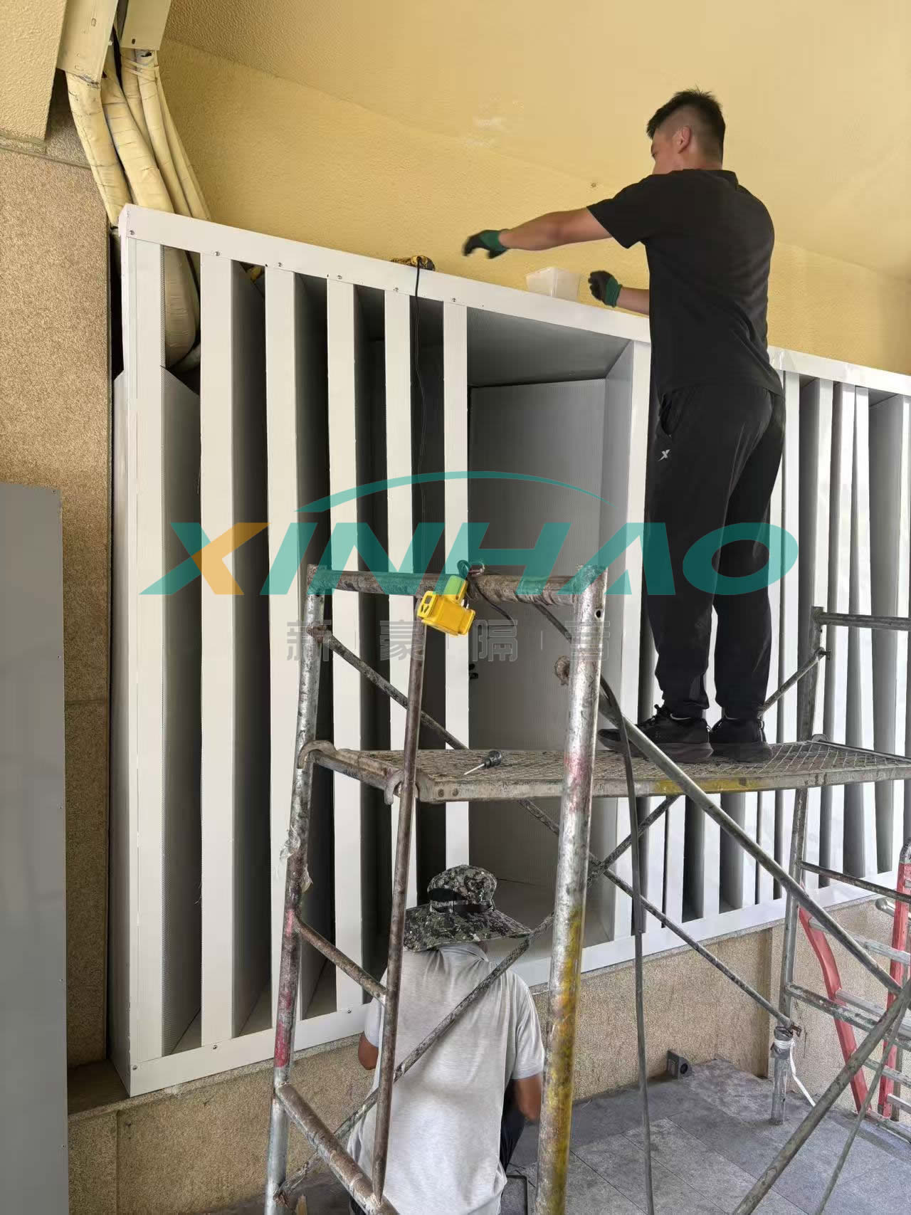 隔聲墻是解決大范圍噪聲源的有效措施,可以有效的阻止噪聲向受影響區(qū)域的輻射,從而減少噪聲影響。為達(dá)到現(xiàn)場的降噪治理要求,隔聲墻必須要采用質(zhì)量過硬、隔聲系數(shù)高的隔聲材料才能保證達(dá)到較高的隔音要求。在空調(diào)室外機(jī)設(shè)備東面利用鋼結(jié)構(gòu)安裝高性能隔聲墻,設(shè)備頂部安裝消聲彎頭高度現(xiàn)場而定,消聲彎頭的高度需低于隔聲墻的高度。