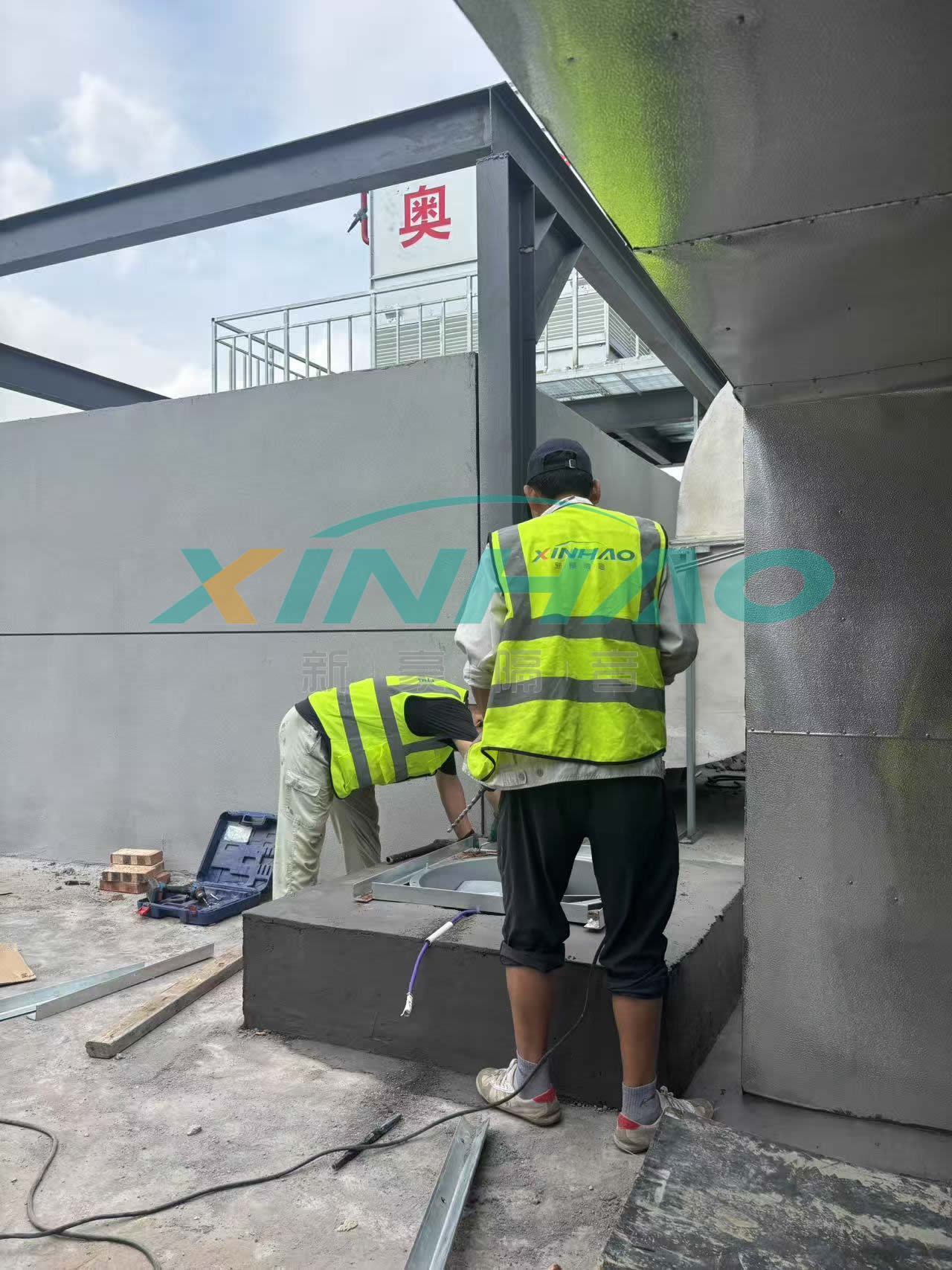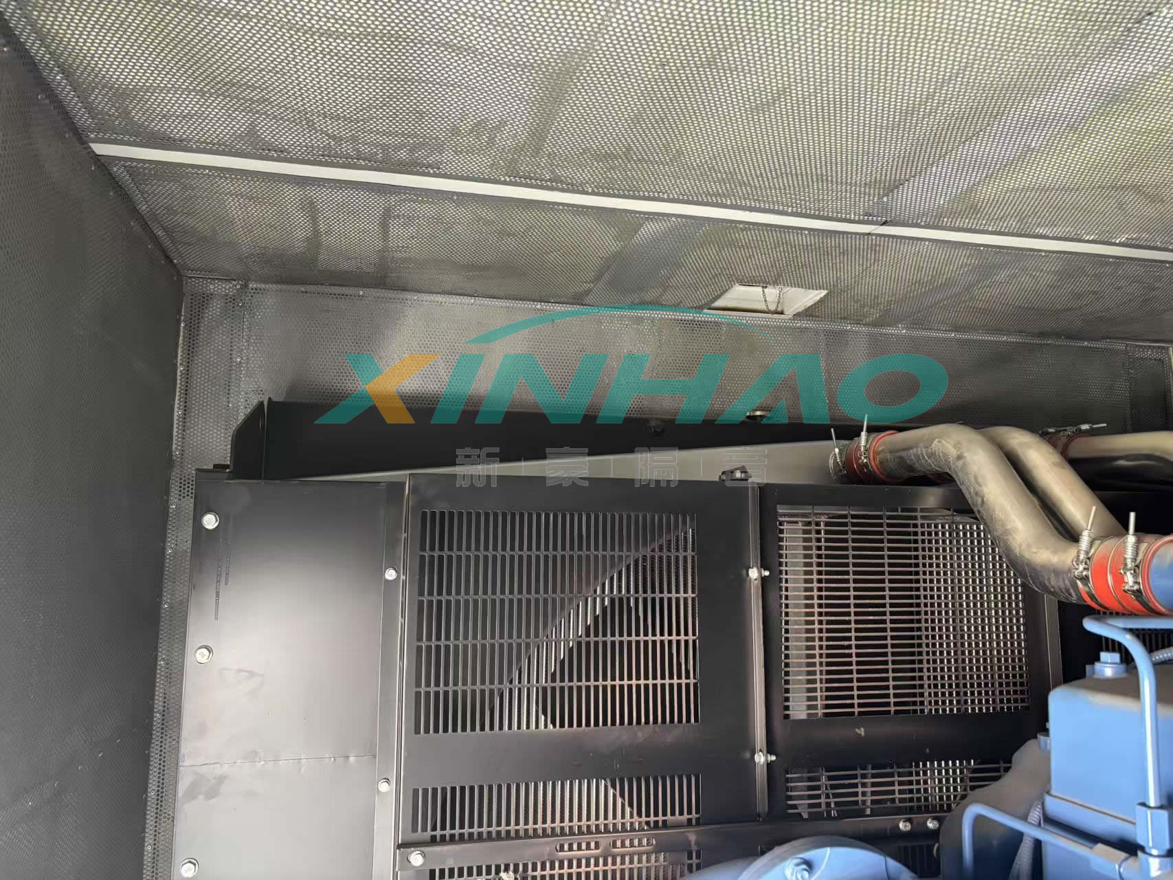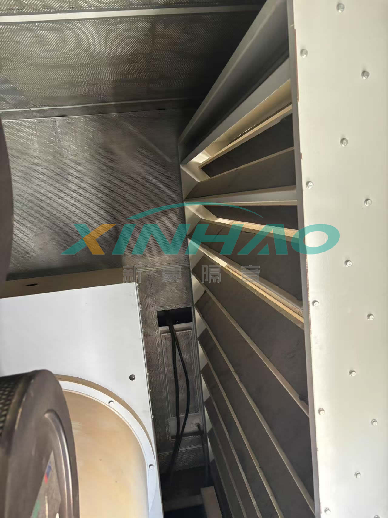 消音外壁構(gòu)造:由1mm的純金屬鋼板做外層板材,板材內(nèi)部添加新豪進(jìn)口隔音材料(隔聲作用)。采用吸音棉粘貼在隔音板材上(吸音作用),內(nèi)側(cè)密封穿孔板。